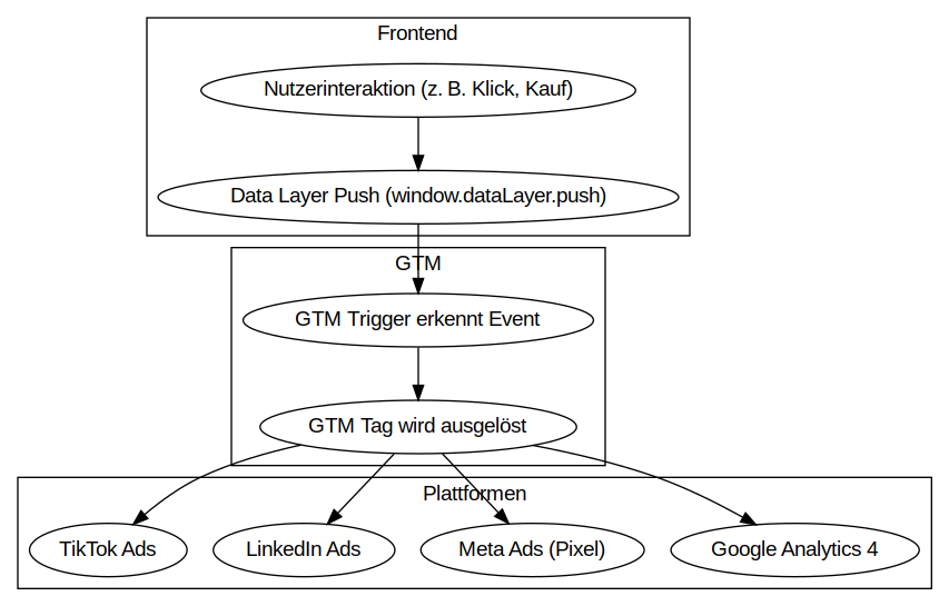 GTM Tag wird ausgelöst z. B. GA4 Event, Meta Pixel Event, Google Ads Conversion
